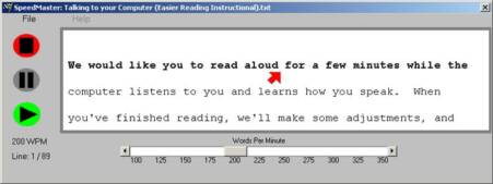 unlimited practice material—and takes the guesswork out of measuring speed-building progress. SpeedMaster™ works only with plain text (.txt) files. When these files are opened through SpeedMaster™, text is displayed on the SpeedMaster™ screen. You can set the text-reading display to any speed you want, ranging from 100 to 350 words per minute, and dictate that text at your set word-per-minute rate.